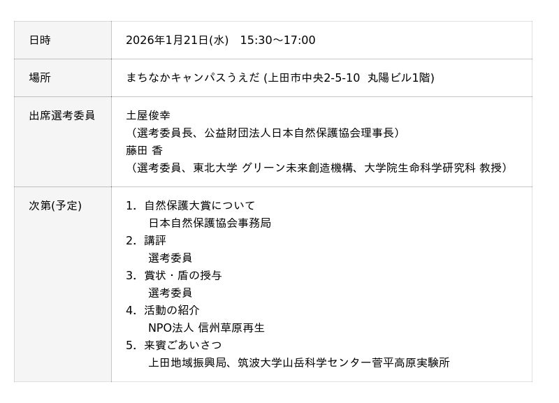 <1/21(水)>「日本自然保護大賞2025」選考委員特別賞 授賞セレモニー開催! (長野県上田市)
