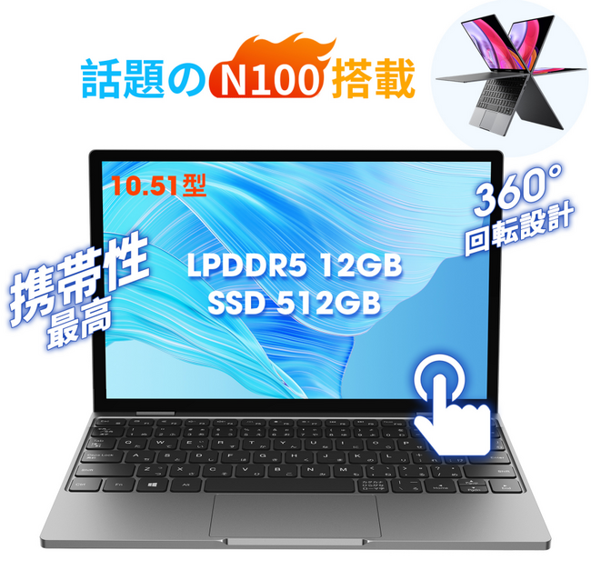 10.51インチディスプレイを搭載したMiniBook Xは、フルスクリーン設計で他の10.51型ノートPCより20%もコンパクトです。360度回転するYogaディスプレイで、利用シーンに合わせて様々なモードに切り替えができます。いつでもどこでも最適なアングルに回転させてご使用いただけます。
