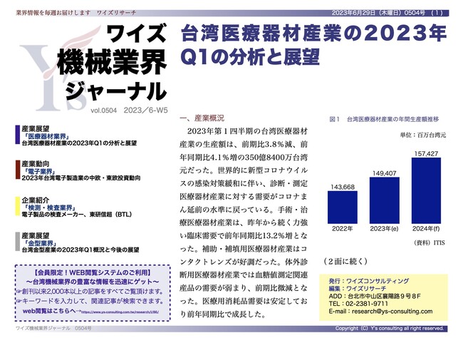 ワイズコンサルティング グループ(本社:中華民国台北市、代表取締役:吉本康志)は台湾機械業界専門誌「ワイズ機械業界ジャーナル」の2023年6月第5週号を発行しました。今週号では医療器材業界、電子業界、検測・検査業界、金型業界の動向を紹介します。