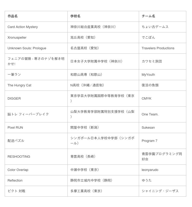 高校生・高専生(3年生以下)の学生を対象としたUnityおよびプログラミング技術習得の奨励、才能の発掘を目的として行われるゲーム開発の全国大会です。2021年度は第8回大会となります。