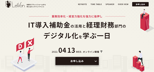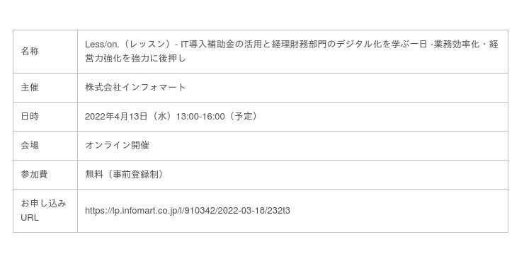 株式会社ライトアップ(本社:東京都渋谷区、代表取締役社長:白石崇、以下ライトアップ)は本年4 月13 日(水)13:00〜16:00に開催される株式会社インフォマート(以下、インフォマート)主催の「Less/on.(レッスン)- IT導入補助金の活用と経理財務部門のデジタル化を学ぶ一日」に弊社執行役員の杉山宏樹が登壇することをお知らせいたします。