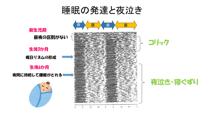 生後6か月〜1歳半くらいの赤ちゃんに見られる「夜泣き」。いつまで続くのか、どう対応したらいいのか、そもそもどうして起きるのか。睡眠の発達とその過程でおこる夜泣きについて、小児科医がお話しします。