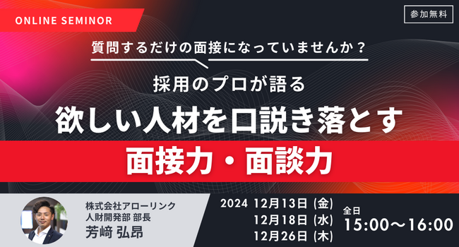 株式会社アローリンク(本社:兵庫県神戸市、代表取締役:蓬莱和真)は、2024年12月13日(金)、18日(水)、26日(木)に無料のセミナーを開催します。本セミナーでは、選考における学生との関わり方や面接の在り方について詳しく解説させていただきます。
