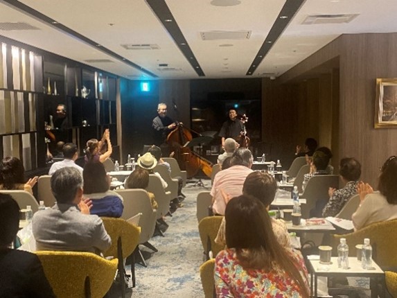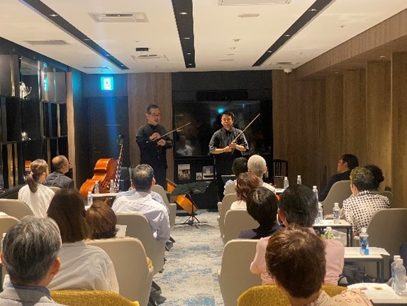 関西を代表するオーケストラ「日本センチュリー交響楽団」のコントラバス奏者・内藤謙一氏とチェロ奏者・渡邉弾楽氏、お二人の実力派アーティストによるダイナースクラブ 大阪梅田プレミアムラウンジ初のコンサートを開催。バッハやヴィヴァルディ、ベートーヴェンなど名曲の数々が演奏されました。曲の合間には、弦楽器や曲の歴史や背景を解説するトークもあり、クラシックになじみがなくても十分に楽しむことができる贅沢なひと時となりました。