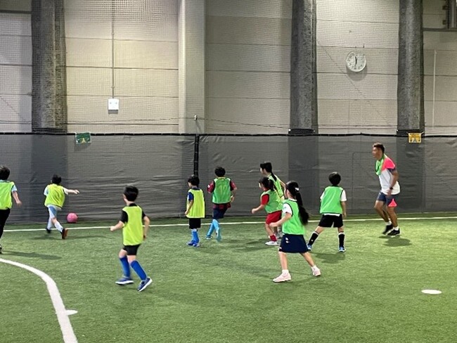 後半は、チームに分かれ、各コーチも混ざってゲームを実施。前半の各コーチからのアドバイスを活かし、パスやシュートを自分なりに工夫している子どもたちもいました。ゲーム終盤は子どもたちのやる気と興奮が最高潮に達し、ゴールが決まると保護者からの歓声だけでなく、子どもたち同士でゴールの喜びを分かち合い、大きく盛り上がりました。