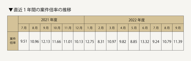 2022年7〜9月の案件倍率は、ITフリーランスへの需要の高さが反映され、7月は9.24倍、8月は10.79倍、9月は11.39倍と推移し、四半期累計での案件倍率は10.46倍と高水準で推移しています。