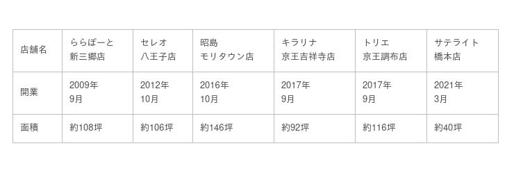 当社は、旗艦店である京王線新宿駅ターミナルビルの「新宿店」と多摩市・聖蹟桜ヶ丘駅の京王聖蹟桜ヶ丘ショッピングセンター内に出店する「聖蹟桜ヶ丘店」の2店舗により、京王線沿線エリアを中心にお客様の毎日の暮らしを彩る価値の提供に努めています。