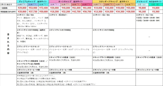 【Camp】プレミアムキャンプ、オートキャンプ(2022年新規)、スタンダードキャンプ、デイキャンプ