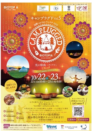 「未病」をテーマとした施設 “未病バレー「ビオトピア」(以下「ビオトピア」)”(株式会社ブルックスホールディングス:神奈川県足柄上郡大井町山田300代表取締役社長:小川裕子)は、2022年10月22日(土)〜23日(日)に自然の中でキャンプと音楽を楽しむイベント「国際me-byoフェスタ2022 CAMPLUGGED Vol.5〜光の祭典ディワリ〜 インドmeets ビオトピア」(主催:株式会社ブルックスホールディングス、後援:インド大使館、神奈川県、大井町)を開催します。外務省認定の日本・南西アジア交流年事業のインド関連イベントです。(「CAMPLUGGED」はCamp(キャンプ)とUnplugged(アンプラグドな音楽)を意味しています。)今年で5回目となる本イベントは、都会では味わえない開放的空間でキャンプと音楽を満喫できる2日間のイベントです。