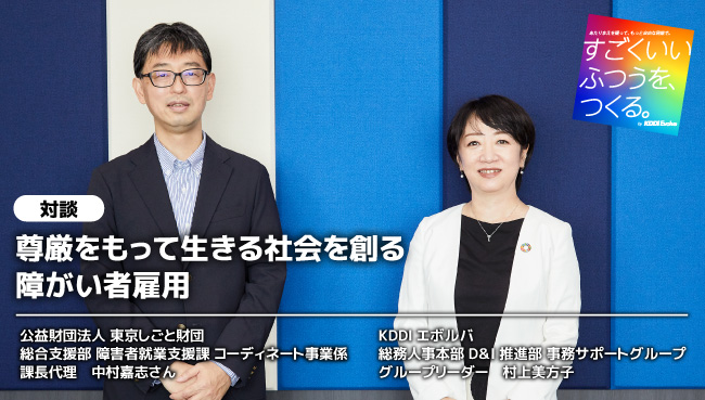 株式会社KDDIエボルバ(本社:東京都新宿区、代表取締役社長:若槻肇、以下KDDIエボルバ)は、都民の雇用・就業を支援する専門機関の公益財団法人東京しごと財団(所在地:東京都千代田区、理事長:中澤基行、以下 東京しごと財団)と、D&I推進に取組むKDDIエボルバ、それぞれの立場から『障がいのある人財がやりがいを持って働き、自立して生活を営んでいくことが「ふつう」である社会』の実現に向けた対談を行い、KDDIエボルバが運営するメディア「すごくいいふつうを、つくる。」に公開いたしました。