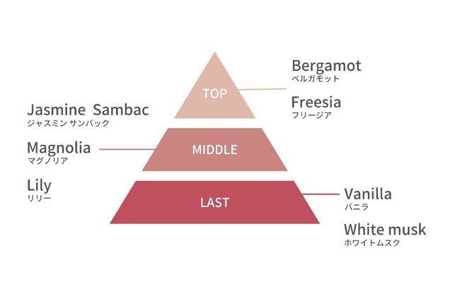 ジャスミンサンバックや、リリーなど豊かな花々と、温かみのあるバニラ、ホワイトムスクの心地よい香り。