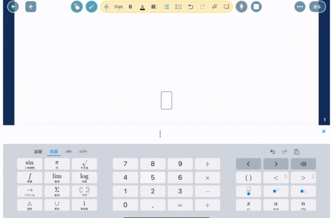 文字入力画面で √x マークを押すと、画面上のキーボードで数式を入力できます。