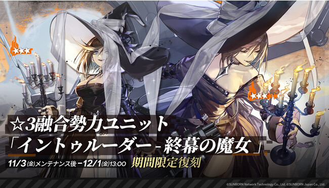 強力な融合勢力ユニットを捕獲できる「捕獲作戦」にて、「11月3日(金)メンテナンス後」より過去の捕獲区域『SP914地区ナイトメア劇場』と『SP914区域』が復刻し、それぞれで★3ユニット「イントゥルーダー」と「イントゥルーダー-終幕の魔女」の捕獲が可能になります。