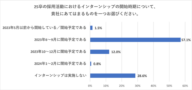 「25卒のインターンシップ開始時期」について質問したところ、「2023年5月以前」が1.5%、「2023年6月〜9月」が57.1%「2023年10月〜12月」が12.0%、「2024年1月〜2月」が0.8%、「インターンシップは実施しない」が28.6%となり、約7割の企業がインターンシップ実施予定、という結果になりました。また、開始時期については、「2023年6月〜9月」が過半数を占めたことから、サマーインターンシップからスタートする企業が多いと言えます。