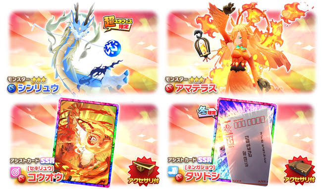 第1弾〜第3弾のそれぞれの期間で獲得しやすいモンスターが異なるピックアップガチャ「新年超スタフェス」を開催します。新年を祝い開催する「新年超スタフェス」は、★3モンスターの出現確率が15%⇒20%にアップします。今回の新★3モンスターは、新血統シンリュウ種「シンリュウ」、キュービ種「アマテラス」の2種、新SSRアシストカードは「【セキリュウ】コウオウ」、「【ネンガジョウ】タツドシ」が登場します。ほかにも、SRアシストカード「【ウロボロス】トロイダル」が新登場。新アシストカードにはそれぞれに血統専用アクセサリ付きイベントが発生します。さらに、同時開催で今月の新モンスターと新アシストカードを手に入れて上限解放を行うと豪華報酬がもらえる新登場キャンペーンも開催します。詳しい参加条件などは、ゲーム内にてご確認ください。