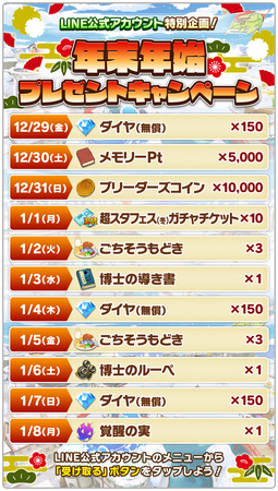 年末年始の8日間、期間中は毎日セットガチャ(10連)を1回無料で行えます。
