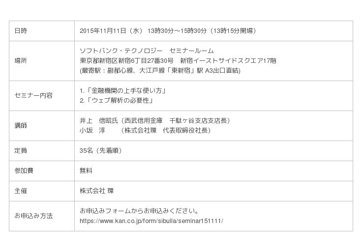 株式会社 環(本社:東京都新宿区、代表取締役社長:小坂 淳、以下 環)は、講師に西武信用金庫 千駄ヶ谷支店長をむかえて「信用金庫支店長×ウェブマーケ会社社長による これからの中小企業の賢い戦い方セミナー」を、2015年11月11日(水)に開催しますのでお知らせします。