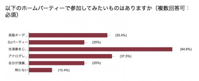 ホームパーティー好きなアラサー&アラフォーに聞いたところ、「生演奏をじっくり聴くパーティー」(64.6%)、「アナログレコードの温かみを感じるパーティー」(37.5%)、「高級オーディオの音質を楽しむパーティー」(35.4%)という結果に。次いで「DJパーティー」「自分が演奏者として楽しむパーティー」といった意見が寄せられました。