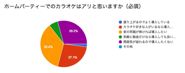 ホームパーティー好きなアラサー&アラフォーに聞いたところ、「盛り上がるのでよく導入している」(2.1%)、「カラオケ好きな人がいるなら導入したい」(27.1%)、「音の問題が無ければ導入したい」(35.4%)、「気軽に数曲だけなら導入したい」(6.3%)という結果になり、防音がネックになっていることがわかりました。
