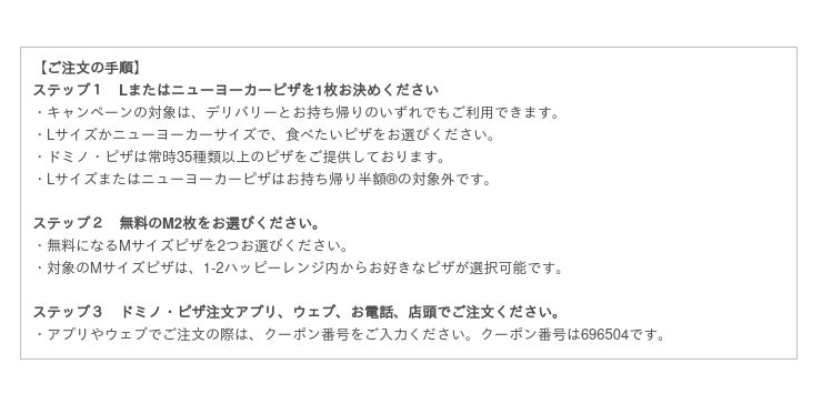 内容 :Lサイズのピザ、またはニューヨーカーピザをお買い上げいただくと、Mサイズのピザを2枚無料でご提供