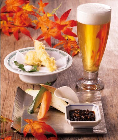 本日おすすめの天ぷら2品と野菜スティックにつけて食べるピリ辛の三升漬けをお供に生ビールを味わえます。
