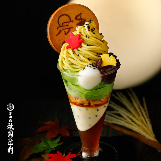 ほうじ茶ゼリーとさつまいもムースの上に抹茶クリームをのせ、お芋のクリームをモンブラン風にトッピングした秋の味覚たっぷりのパフェです。