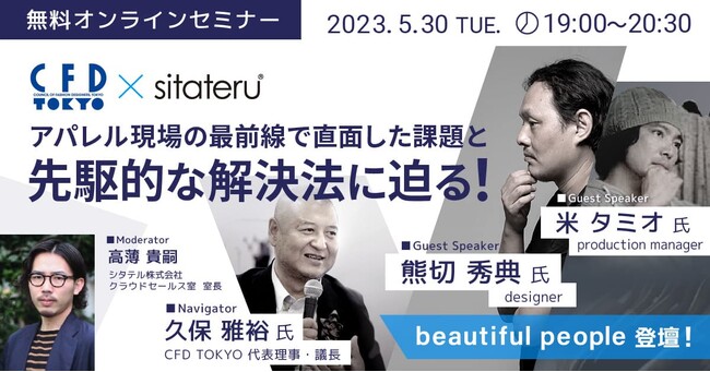 衣服・ライフスタイル産業が抱える社会課題を解決するクラウドサービス「sitateru CLOUD」を提供するシタテル株式会社(本社:熊本県熊本市、代表取締役:河野秀和、以下シタテル)は、一般社団法人東京ファッションデザイナー協議会(本社:東京都渋谷区、代表理事・議長:久保雅裕、以下CFD TOKYO)と共催で、無料オンラインセミナー『アパレル現場の最前線で直面した課題と先駆的な解決法に迫る!』を5月30日(火)に開催いたします。
