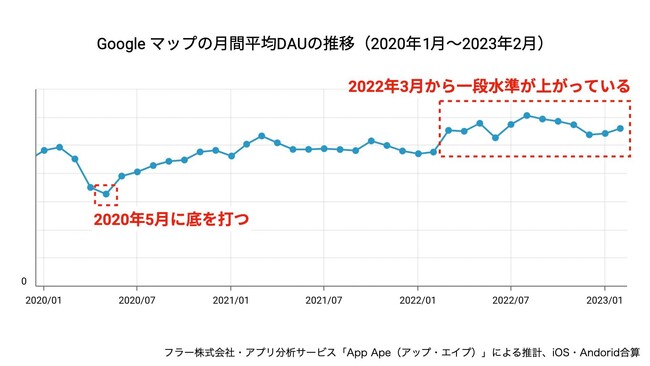 フラーのデジタルノート記事「コロナ5類へ。旅行アプリの利用はコロナ前の水準に戻っているのか?」によると、Googleマップの月間平均DAUでは、緊急事態宣言に伴い2020年5月に底を打った後、コロナ前の8〜9割ほどの水準で推移しました。