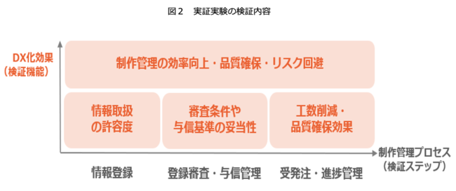 本プラットフォームを用いたコンテンツ制作の効率向上・品質確保・リスク回避の効果や改善点を検証します。具体的には、アカウント申請時の情報登録・取り扱いの許容度、アカウントの審査条件や与信基準の妥当性、コンテンツ制作に必要なオンライン受発注機能や進捗管理機能による工数削減・品質確保の効果を検証します(図2)。