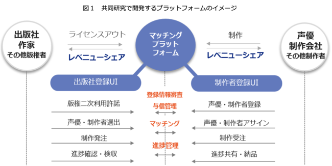 本プラットフォームは、DXによるオーディオブック制作管理のワンストップ化、受発注手続きのシステム処理、版権者(出版社、作家、他の版権者を含む)と制作者(声優、制作会社、他の制作者を含む)のマッチング機能を実現することを目的とします(図1)。
