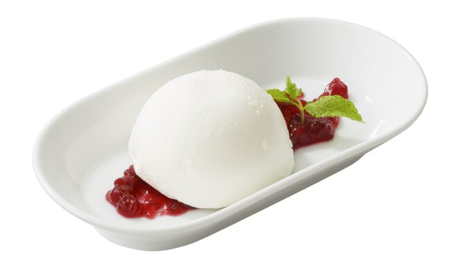 プラントベースソフトクリームに、甘酸っぱいベリーのソースをかけました。