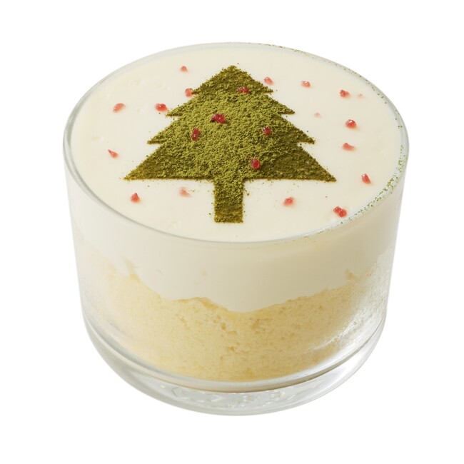 ロールケーキが丸ごと入ったボリューム満点のミニパフェ。中にはホイップクリームとストロベリーダイスが入っています。クリームチーズ風のソースの上には、かわいいツリーのデザインが。