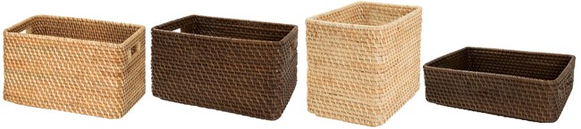 人気のラタンバスケットはナチュラルとブラウンの2色展開で、ご自宅の雰囲気に合わせて好きなカラーをお選びいただけます。レギュラーサイズ以外にも、たて型ハーフサイズ・よこ型ハーフサイズもあわせてお値下げ中です。
