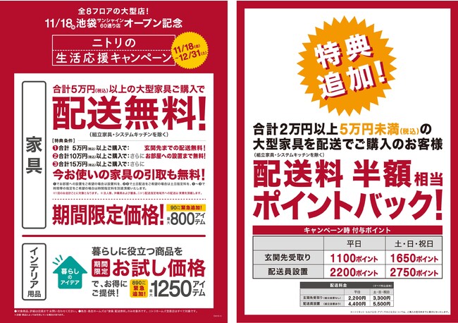 12月31日 (土)まで期間限定で「生活応援キャンペーン」を全国で実施中。2050アイテムが限定価格・お試し価格にて販売中です。合計5万円(税込)以上の大型家具・大型家電のご購入で配送料無料(組立家具・システムキッチンを除く)になります。また、税込み合計2万円から5万円未満の大型家具配送のご注文は、配送料金半額相当のポイントバックを実施中です。
