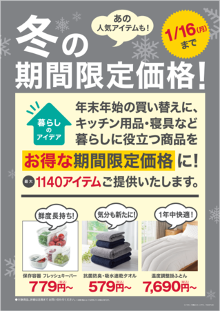 1月16日(月)までの期間中、寒い冬や年末年始の時期にぜひ使っていただきたい、寝具やキ ッチン・バス用品など、暮らしに役立つ最大1140アイテムを「期間限定価格」にてご提供中です。