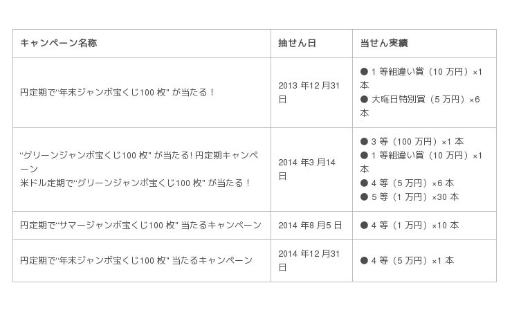 対象期間中、円定期預金(積み立て定期預金を含む)の増加額が 100 万円以上かつ、判定日時 において満 20 歳以上の日本国内にお住まいのお客さまの中から、抽選で 100 名さまそれぞれに、 2015 年 11月発売予定の “年末ジャンボ宝くじ 100 枚” をプレゼントします(ご応募不要)。