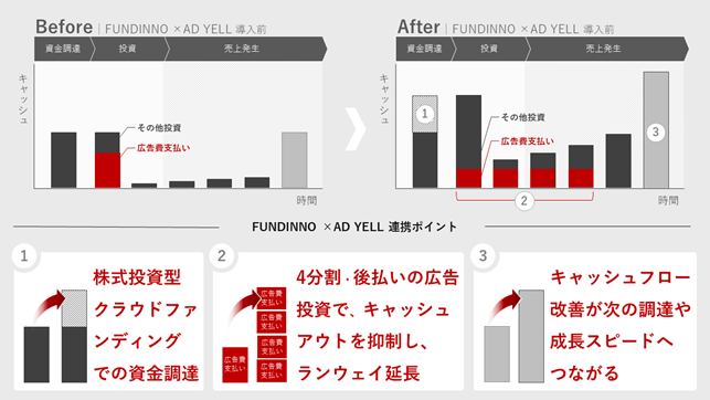 しかし、そのような課題を抱えるスタートアップ・ベンチャー企業に、バンカブルの広告費の4分割・後払い(BNPL)サービス「AD YELL(アドエール)」を提供することにより、今まで当社が支援することができなかった「資金調達後のキャッシュフローを圧迫しない効率的な資金運用のサポート」が可能となります。また同様にバンカブルの顧客にはFUNDINNOでの資金調達によるサポートを行うことで、「広告投資前に財務状況の改善が必要な企業」のサポートが可能となります。