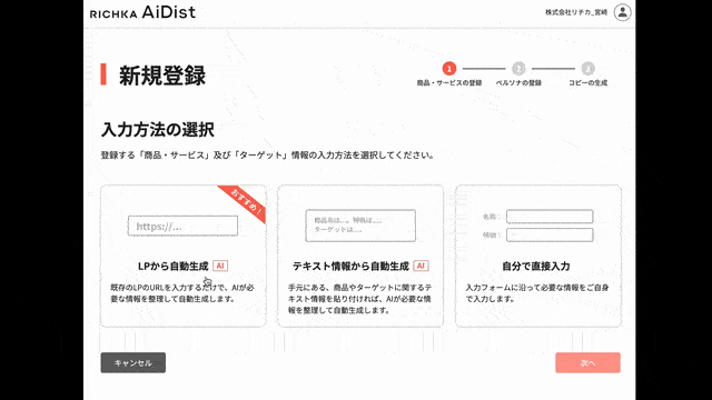 株式会社リチカ(本社:東京都渋谷区 / 代表取締役:松尾幸治 / 以下、当社)は、AIマーケティング・アシスタント「RICHKA AiDist(リチカ アイディスト)」の新機能として、LPのURLを入力するだけで、商品情報・ターゲット情報が出力でき、よりかんたんに広告コピー生成までを行える新しい機能をリリースしました。