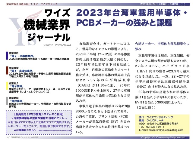 【台湾情報】2023年台湾車載用半導体・PCBメーカーの強みと課題<ワイズ機械業界ジャーナル2023年8月第4週号発行>
