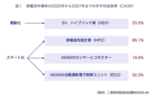 車載用半導体は現在、車体制御、安全システム用の割合が最も大きいが、27年にはEV、ハイブリッド車(HEV)向けの割合が23.9%と最大になる見通しだ。一方、22〜27年の年平均成長率では車載高性能計算(HPC)向けが最大になる見込みだ。22年の新車に搭載された半導体の数は1台当たり平均1400個だったが、EVは1台当たり3000個に上った。 EVの普及に伴い、自動車サプライチェーン(供給網)の再編が進む見通しで、半導体と部品標準化の分野で強みを持つ台湾メーカーは異業種との提携により先行需要の取り込みが期待できる。