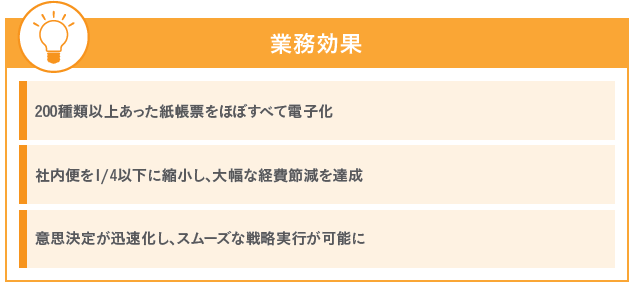 社内便を1/4程度に削減し、人件費やコストの削減も達成されたほか、迅速な意思決定の実現によりスピーディーな経営にも貢献