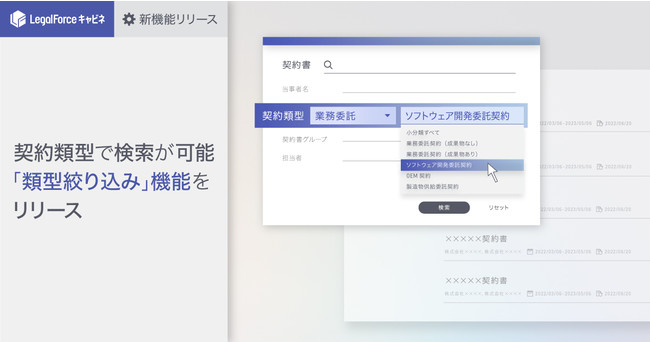AI契約管理システム「LegalForceキャビネ」 を提供する株式会社LegalForce(本社:東京都江東区 代表取締役:角田望、以下LegalForce)は、「LegalForceキャビネ」にアップロードした契約書から、類型を指定して契約書を検索できる「類型絞り込み」機能をリリースしました。本機能により、契約書検索で類型を指定して契約書を絞り込み、目的の契約書を短時間で探しやすくなります。
