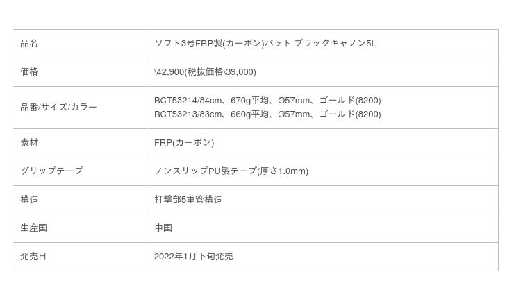 「ベースボールを科学する。」ゼット株式会社(本社/大阪市天王寺区、代表取締役社長/渡辺裕之)は、打撃部5重管構造により異次元の高反発力を発揮するソフト3号FRP製(カーボン)バット【ブラックキャノン5L】を発売します。