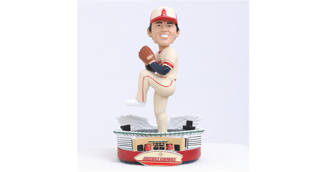 大谷翔平が2023年にピッチャーとして最後に投げたマウンドで着用していたCity Connectユニフォーム、さらにエンゼルス球場の台座が付いたエンゼルス最後のMLBオフィシャル・ライセンス・ボブルヘッド人形です。