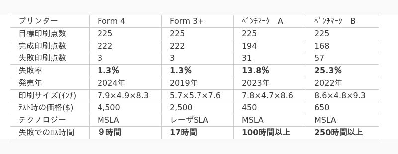 2024年にリリースされたForm 4 の印刷成功率は 98.7% と集計されました。これは、現場でのパフォーマンス向上の為に 5年間に渡り継続的に改良されてきた Form 3+ と同等です。ベンチマーク プリンター A と B の印刷成功率はそれぞれ 86.2% と 74.7% で、これは 13.8% と 25.3% の失敗率に相当します (Form 4 の場合は 1.3%)。これは、ベンチマーク プリンターの失敗率が Form 4 の 10 倍から 20 倍であり、ベンチマーク B では 4 回の印刷のうち 1 回が失敗していることを示しています。