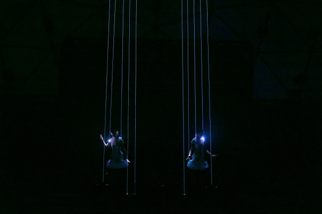 手首・肘・頭を投射ポイントに設定することで、本来、FEMMの動きがレーザーのコントローラーとなっているが、逆にレーザーが操り“糸“がごとくFEMMを操作しているように見せるため、コレオグラフ含むアナログ演出に、心理的逆転を誘引するコンテクストを仕掛けたマリオネット(操り人形)ダンス・パフォーマンス。