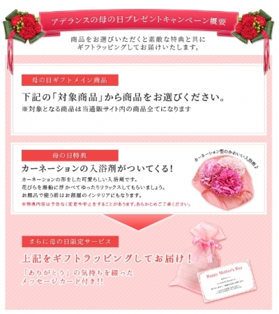 2. 女性向けヘアケア商品をご購入いただき、プレゼントギフト包装をご希望されると、「フラワーカーネーション入浴剤ブーケ」と「メッセージカード」を無料でセットにし、ギフトラッピングの上、母の日にお送りいたします。