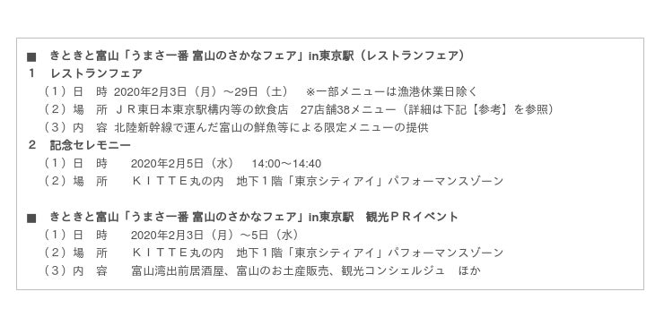 本フェアは、東京駅の商業施設を運営する株式会社鉄道会館との連携により実施するもので、富山の鮮魚を使った特別メニュー等を提供します。また特別メニューによく合う、富山のきれいな水と米で作られた芳醇で味わい深い日本酒の提供も予定しています。
