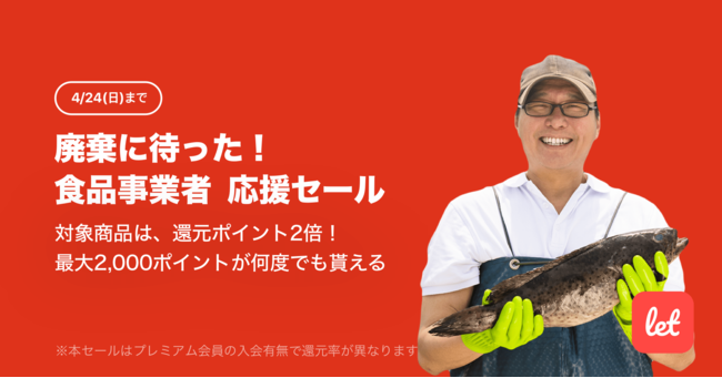 株式会社レット(本社:東京都港区、代表:佐藤 航陽)が運営する、食品ロス/在庫ロス削減のマーケット「Let(レット)」内で「廃棄に待った!食品事業者 応援セール」を4月22日(金) 18:00より開催します。期間中、プレミアム会員様限定で対象の食品をご購入いただくと、2,000ポイントを上限に還元ポイントが2倍になります。期間中のご購入であれば、ポイント還元はお一人様あたり何度でもご利用いただけます。