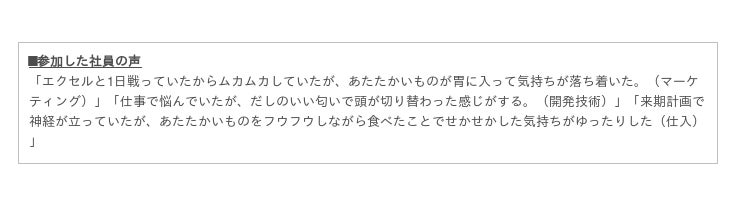 その結果、「へこんだ」※1状態の社員56名のうち85.7%がへこんだ状態がやわらぐ※2という試験結果となりました。また「ぐったり」「もやもや」した気持ちが鍋を食べたら「ほっこり」「ぽかぽか」に変化し、気持ちが落ち着いたという声も見られました。